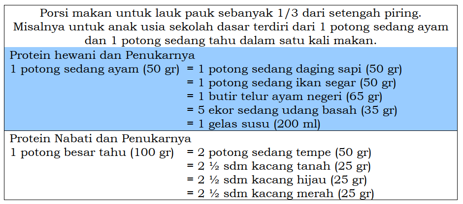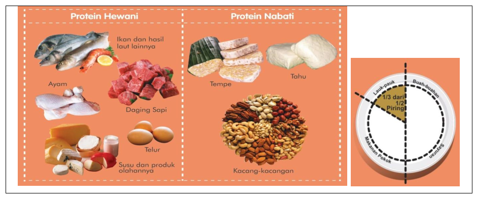 Protein hewani seperti daging (sapi, kambing, dll), unggas (ayam, bebek, dll), ikan dan hasil laut lainnya, telur, serta susu dan hasil olahannya. Protein nabati seperti tahu, tempe, kacang-kacangan (kacang merah, kacang tanah, kacang hijau), dan lain-lain.